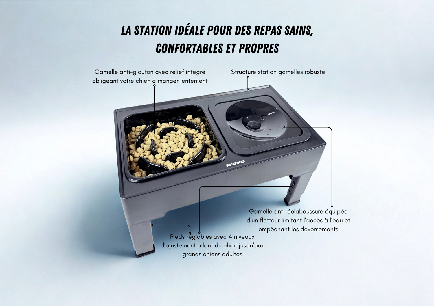 Chez SACAPUCES, nous pensons que l’alimentation de votre chien doit être à la fois saine, propre et adaptée à ses besoins physiologiques. C’est pourquoi nous proposons une station de gamelles réglable et intelligente, qui favorise une meilleure digestion, évite les éclaboussures et grandit avec votre loulou.