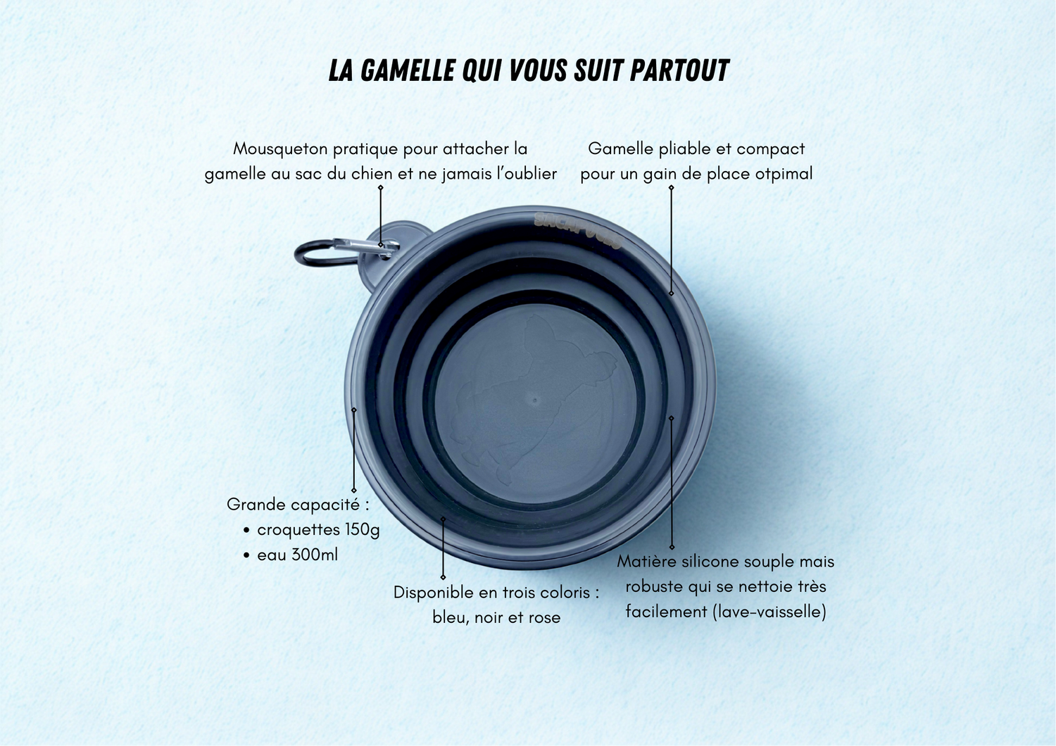 Chez SACAPUCES, nous pensons que voyager avec son chien doit être simple et sans contraintes. C’est pourquoi nous proposons une gamelle pliable et ultra-pratique, qui se glisse partout et s’utilise en un clin d’œil, pour que votre chien reste hydraté et rassasié en toute circonstance.