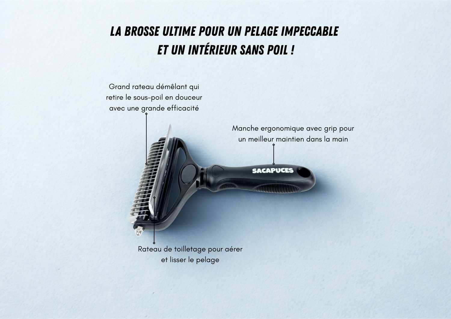 Chez SACAPUCES, nous savons que le toilettage doit être un moment de plaisir, pas de lutte. C’est pourquoi nous proposons une super brosse 3-en-1 qui combine démêlage, élimination du sous-poil et entretien du pelage, pour un résultat impeccable en un seul geste.